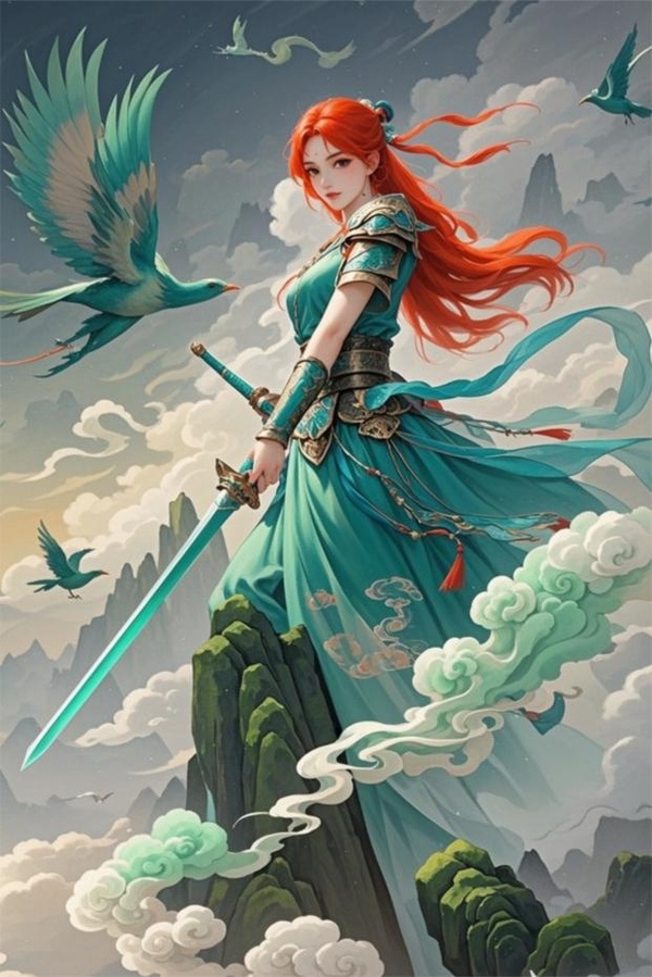 只見伊莉絲一頭飄逸的紅髮紮成馬尾,身著青色仙裙,裙上綉著青鸞和流動的青雲。