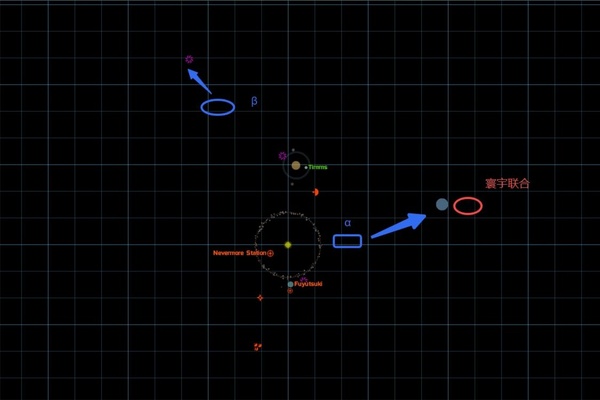 (α、β和寰宇聯合位置如下,如果李斌從跳躍點進來,洛雨會拆分目標β的艦隊拖延時間,進一步斷尾,但依舊用目標α來遲滯。她做的這個局,是基於之前與人類多次交꿛的經驗,基於人類厭惡風險的心理選擇的高概率設計,總之,洛雨將自己在風險星系的布局,設計為最多小敗,但整體虧損不大的方向껗。她用虧損換取了時間和空間)