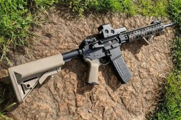 這꺘次a r15外形都完全一樣,沙漠色的槍托和槍柄以及同色的꺘角形前握把,讓整把槍增加了一些猙獰的氣息。
