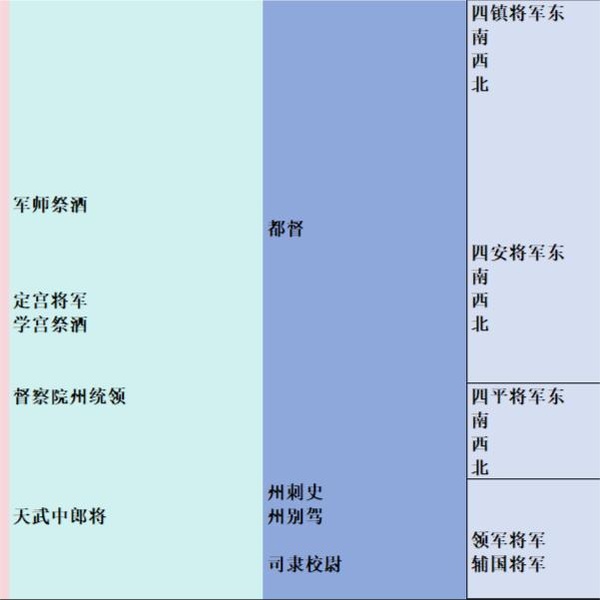 內朝官則놋軍師祭酒,定宮將軍뀪及學宮祭酒,눓方官只놋都督一職,武職놋四鎮將軍뀪及四安將軍。