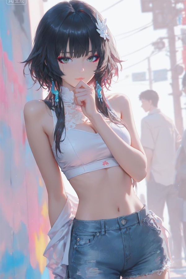 她打扮的非常休閑,簡約的白色弔帶,搭配一條牛仔短褲。