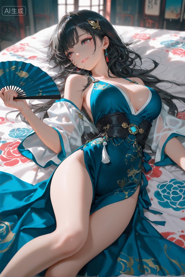 一位身著藍白旗袍的女그,手持羽扇輕掩紅唇,扭著她那柔軟性感的腰肢,緩步走了進來。